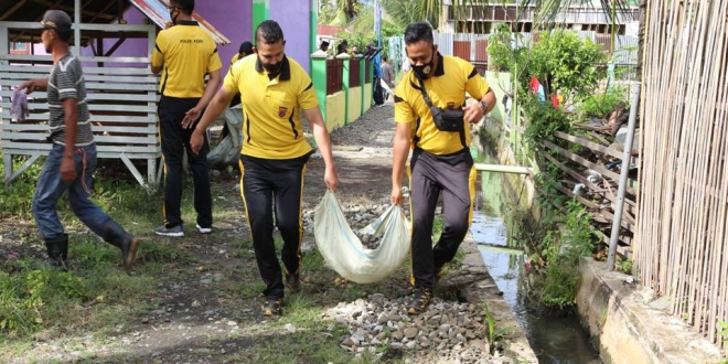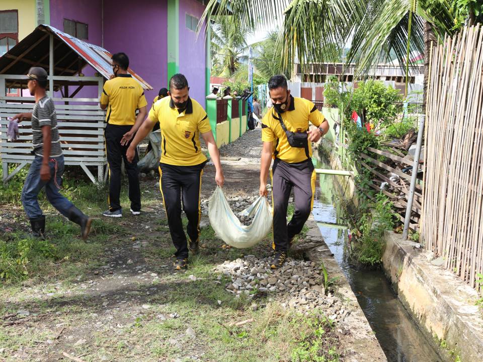 Personel Polres Aceh Tenggara beserta Koramil Babussalam, Camat Babussalam, Kepala Puskesmas Kota dan Masyarakat Desa Ujung Barat melaksanakan kegiatan gotong royong di Desa Ujung Barat, Jum’at (10/7/2020) Pukul 09.00 Wib.