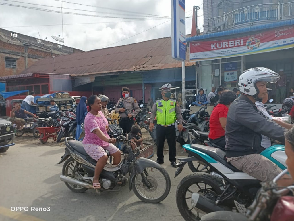 Personel Polsek Lawe Sigala-gala Melaksanakan Pengaturan Arus Lalu – Lintas Kenderaan di pasar tumpah Kecamatan Lawe Sigala-gala Kabupaten Aceh Tenggara, Selasa (07/07/2020) Pukul 09.00 Wib.