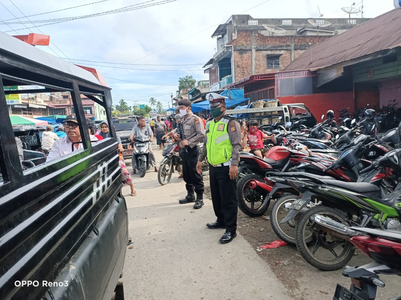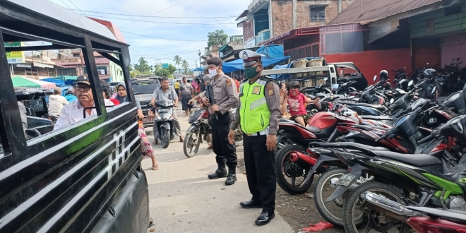 Personel Polsek Lawe Sigala-gala Melaksanakan Pengaturan Arus Lalu – Lintas Kenderaan di pasar tumpah Kecamatan Lawe Sigala-gala Kabupaten Aceh Tenggara, Selasa (07/07/2020) Pukul 09.00 Wib.