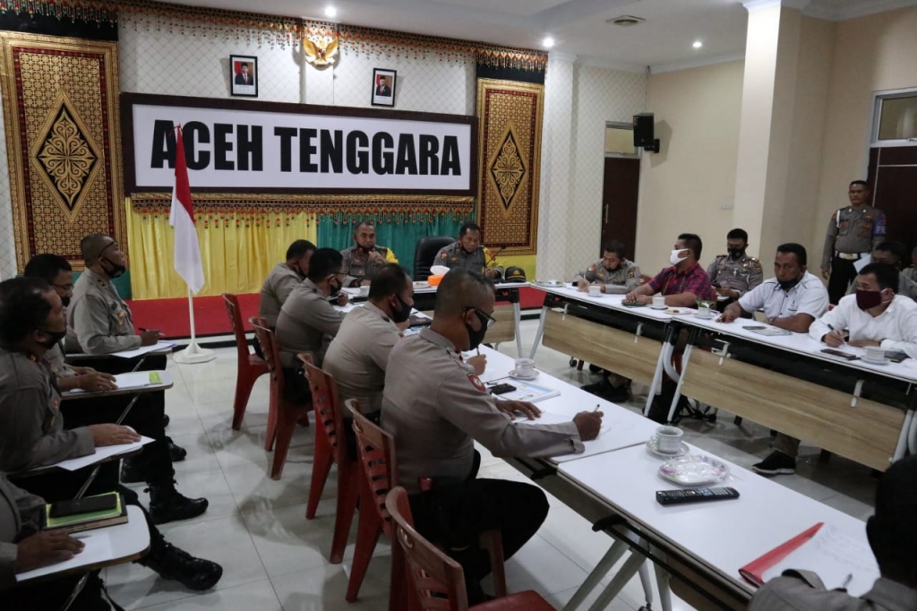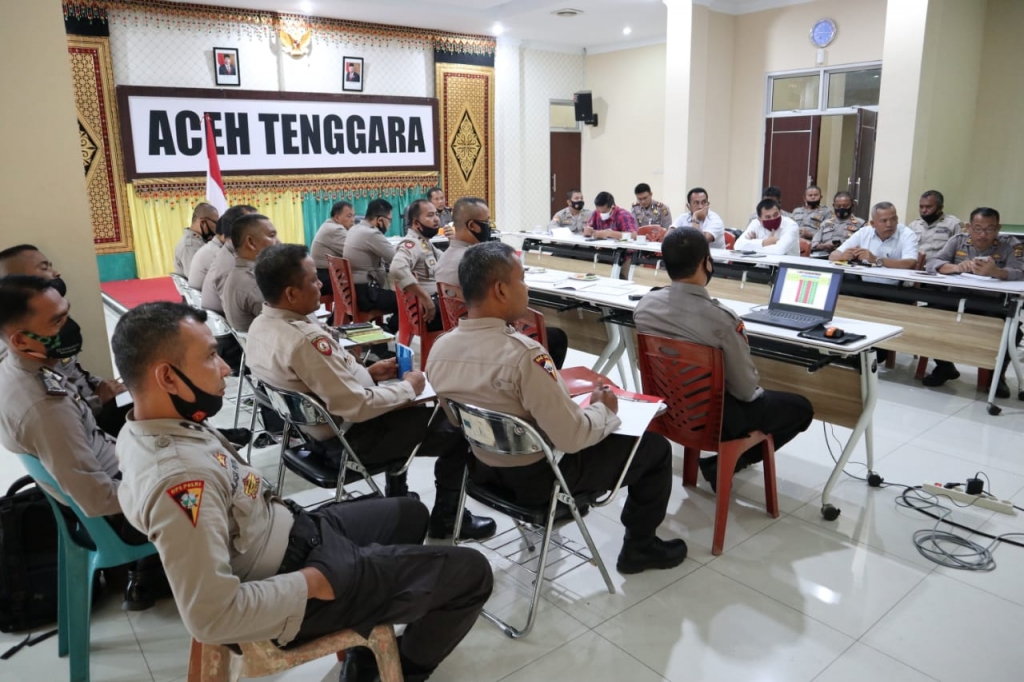 Kapolres Aceh Tenggara AKBP Wanito Eko Sulistyo.S.H,S.I.K di dampingi Kabag Ops Pores Aceh Tenggara Akp Yasir, S.E., M.S.M, pimpin Anev Bulanan di Aula Wira Pratama Polres Aceh Tenggara, hari Selasa tanggal 11 Agustus 2020 pukul 09.00 Wib.