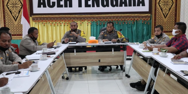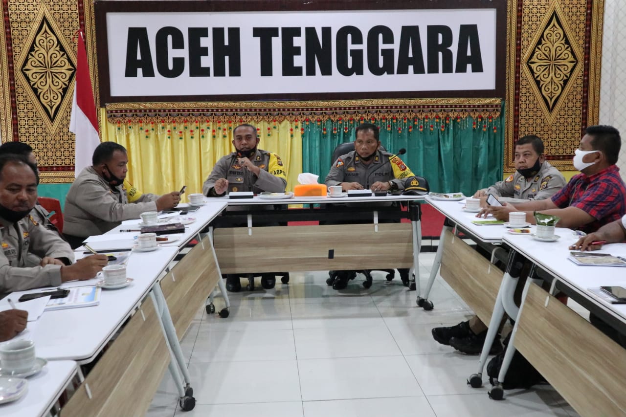 Kapolres Aceh Tenggara AKBP Wanito Eko Sulistyo.S.H,S.I.K di dampingi Kabag Ops Pores Aceh Tenggara Akp Yasir, S.E., M.S.M, pimpin Anev Bulanan di Aula Wira Pratama Polres Aceh Tenggara, hari Selasa tanggal 11 Agustus 2020 pukul 09.00 Wib.