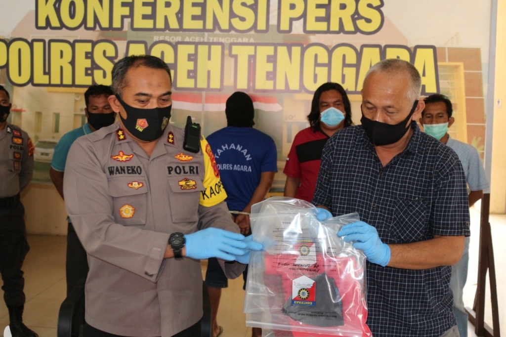 Kapolres Aceh Tenggara AKBP Wanito Eko Sulistyo, S.H., S.I.K. memberi keterangan dalam konferensi pers penangkapan pelaku penganiayaan terhadap ustad yang lagi ceramah memperingati Maulid Nabi Besar Muhammad SAW, bertempat di Mesjid Al- Husna di Desa Kandang Mbelang Mandiri Kecamatan Lawe Bulan Kabupaten Aceh Tenggara. Jum’at (30/10/2020) Pukul 10.00 Wib.