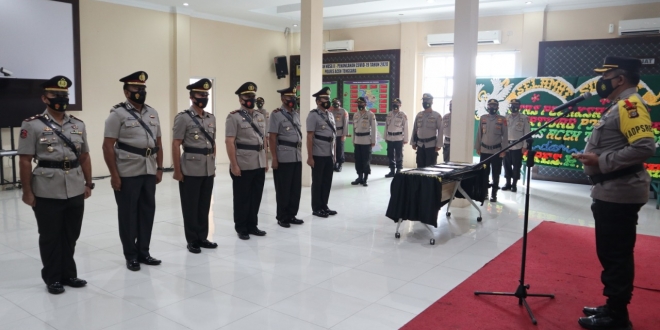 Kepolisian Resor Aceh Tenggara menggelar upacara serah terima jabatan Kasat Narkoba, Kasat Sabhara, Kapolsek Semadam dan Kapolsek Babul Rahmah yang di Laksanakan di Aula Wirapratama Polres Aceh Tenggara, Rabu (06/1/2021), Pukul 09.00 Wib.