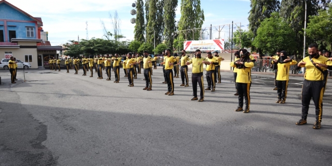 Personel Polers Aceh Tenggara melaksanakan Olah Raga senam di lapangan Apel Mapolres Aceh Tenggara, Jum’at (08/1/2021) Pukul 07.30 Wib.