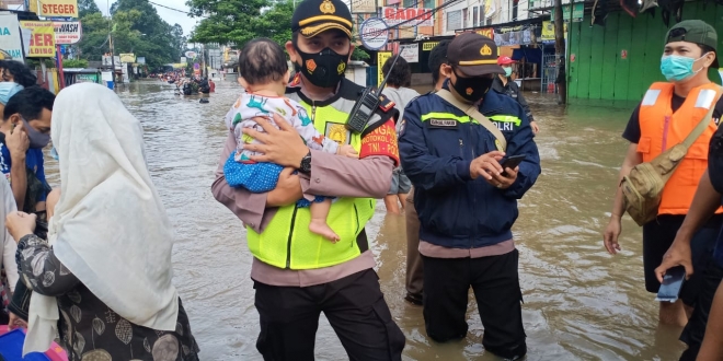 Sementara itu, polisi juga melakukan evakuasi dan bantuan ke wilayah Kabupaten Bekasi yang terdampak tanggul Sungai Citarum yang jebol. Diantaranya, Kampung Babakan Banten, Desa Sumber Urip, Pebayuran, Kabupaten Bekasi.