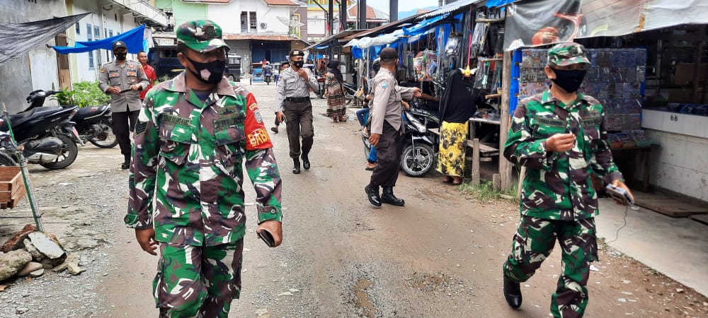 Personel Polsek Babussalam dan Koramil Babussalam melaksanakan Sosialisasi Himbauan Penggunaan Masker kepada Masyarakat Kecamatan. Babussalam Kabupaten Aceh Tenggara, Selasa (18/5/2021) Pukul 11.00 Wib