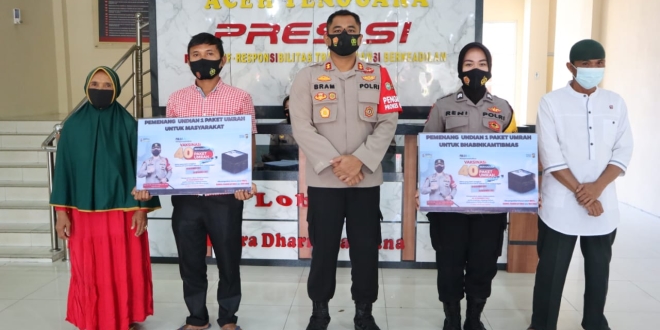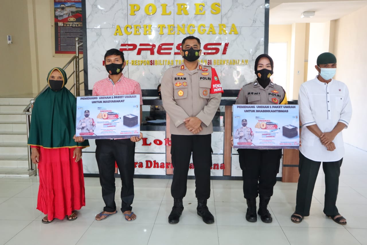 Polda Aceh diwakili Kapolres Aceh Tenggara AKBP Bramanti Agus Suyono, S.H., S.I.K.,M.H. menyerahkan voucher gratis umroh kepada saudara Arapat dan Bhabinkamtipmas Briptu Reni Fionita, pemenang undian vaksinasi massal Tahap ke 3 Wilkum Polres Aceh Tenggara. Rabu (05/01/2022).