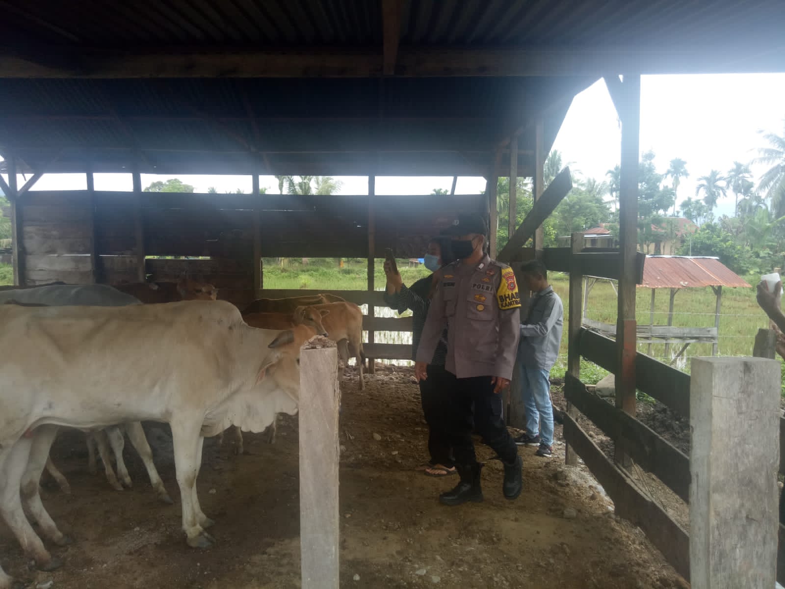 Aipda Radi Bustami selaku Bhabinkamtibmasl Polsek Darul Hasanah jajaran Polres Aceh Tenggara meninjau lokasi hewan ternak di Desa Mamas Kecamatan Darul Hasanah untuk memastikan benar-benar bebas dari penyakit mulut dan kuku (PMK), Selasa (18/10/2022).