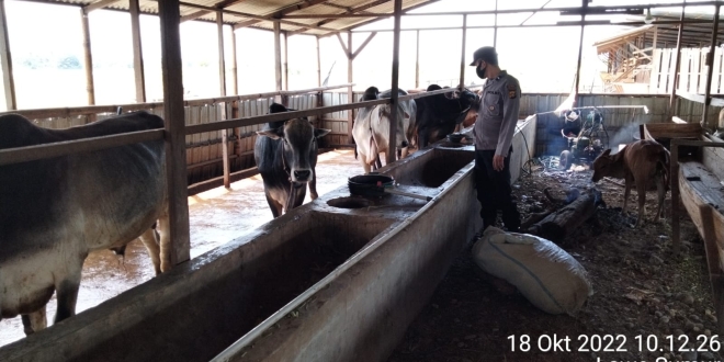 Bripka Tenang selaku Bhabinkamtibmas melakukan pemantauan secara langsung untuk mengetahui kesehatan ternak dengan menyambangi kelompok ternak Desa Kandang Mbelang Mandiri, Kamis (20/10/2022).