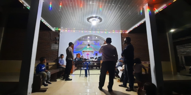 Jajaran Polsek Polres Aceh Tenggara melakukan pengamanan kebaktian atau Misa jelang perayaan Natal tahun 2022 di Wilayah Hukum Polres Aceh Tenggara. Minggu (18/12/2022).