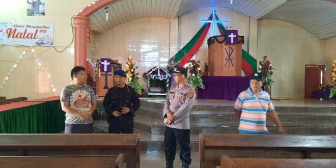 Kapolsek Lawe Sigala bersama Personel penjinak Bom dari Brimob yang BKO Sat Brimob Polda Aceh Kompi 4 Batalyon C Pelopor Gayo Lues melaksanakan seterilisasi ke Gereja Gereja HKBP Lawe Sigala Desa Lawe Sigala Timur Kecamatan Lawe Sigala-gala Kabupaten Aceh Tenggara, Sabtu (24/12/2022).