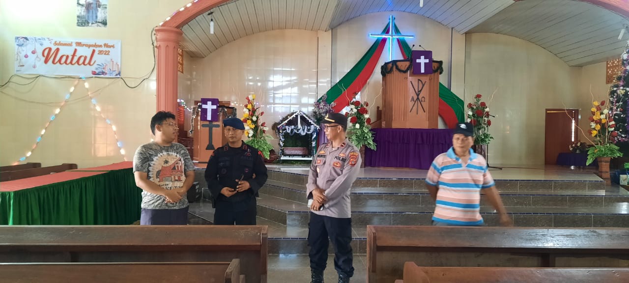 Kapolsek Lawe Sigala bersama Personel penjinak Bom dari Brimob yang BKO Sat Brimob Polda Aceh Kompi 4 Batalyon C Pelopor Gayo Lues melaksanakan seterilisasi ke Gereja Gereja HKBP Lawe Sigala Desa Lawe Sigala Timur Kecamatan Lawe Sigala-gala Kabupaten Aceh Tenggara, Sabtu (24/12/2022).