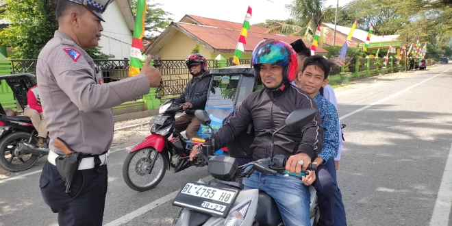 Personel Sat Lantas Polres Aceh Tenggara Melaksanakan Pengaturan serta pemantauan arus lalulintas terhadap masyarakat pengguna jalan khususnya para pelajar saat pulang dari Sekolah di Jalan Kutacane – Medan tepatnya Desa Gumpang Jaya (Komplek Pelajar) Kecamatan Babussalam Kabupaten Aceh Tenggara, Sabtu (07/1/23).