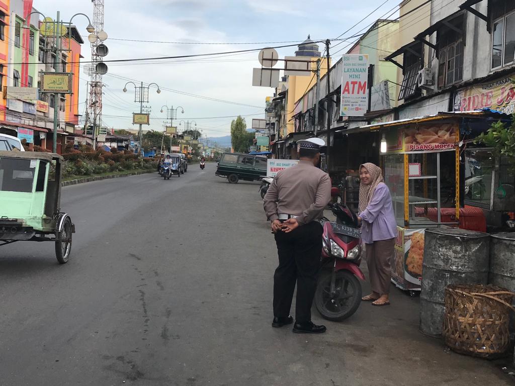 Personel Sat Lantas Polres Aceh Tenggara Melaksanakan Pengaturan serta pemantauan arus lalulintas terhadap masyarakat pengguna jalan yang berlokasi di Jalan Jenderal Ahmad Yani Kutacane, Kecamatan Babussalam Kabupaten Aceh Tenggara, Minggu (21/1/23).