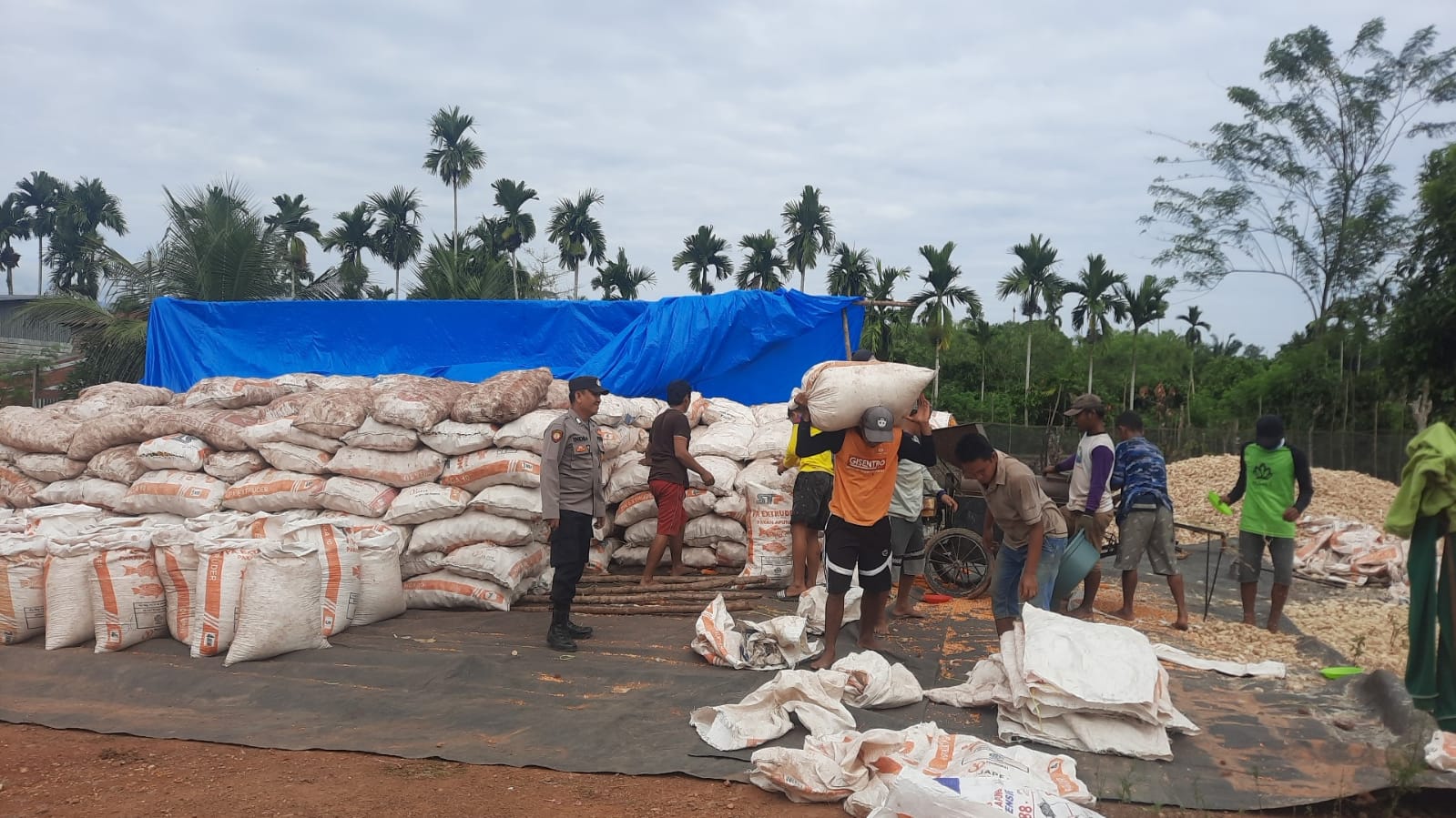 Seorang Bhabinkamtibmas yang bertugas di Polsek Badar , membantu warganya yang sedang membersihkan hasil panen berupa Padi di Desa Peranginan Kecamatan Badar Kabupaten Aceh Tenggara, Senin (20/02/23).