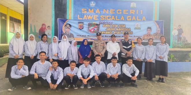 Polsek Lawe Sigala-Gala Salah Satu upaya Polri dalam mencegah penyalahgunaan narkoba khususnya di kalangan pelajar dan pemuda yang sampai saat ini cukup mengkhawatirkan, maka Polsek Lawe Sigala Polres Aceh Tenggara yang dalam hal ini Kanit Binmas Polsekmemberikan penyuluhan dan sosialisasi tentang bahaya Narkoba dikalangan pelajar.