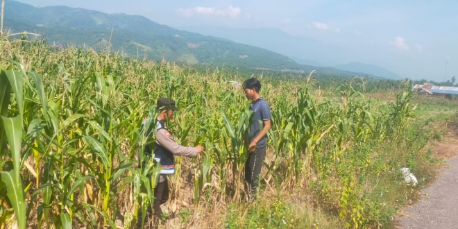 Bhabinkamtibmas Polsek Babul Rahmah Bripka Ilham tinjau Ketahanan Pangan dan membantu warga dalam rangka mewujudkan ketahanan pangan masyarakat di Desa Sumur Alas kecamatan Babul Rahmah Kabupaten Aceh Tenggara, Sabtu (18/3/23) pukul 09.30 wib.