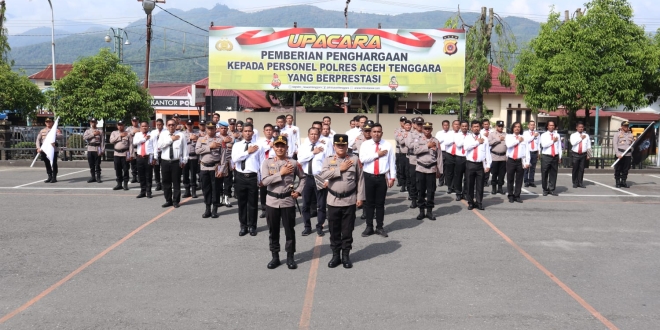 “Jumlah personel yang kami beri penghargaan sebanyak 100 personel Polres Aceh Tenggara. Dedikasi penghargaan kami berikan dalam hal membantu meningkatkan kinerja,” Kapolres mengucapkan terima kasih kepada anggotanya, yang telah memberikan kontribusi yang baik kepada institusi Polri khususnya di Polres Aceh Tenggara.