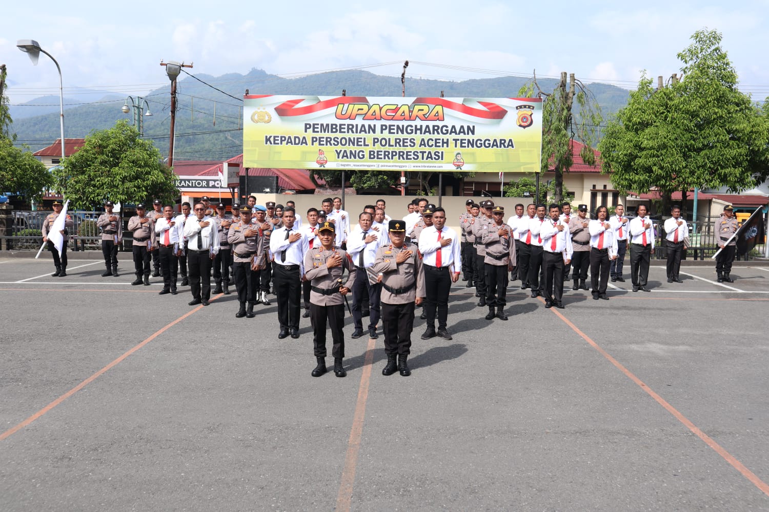 “Jumlah personel yang kami beri penghargaan sebanyak 100 personel Polres Aceh Tenggara. Dedikasi penghargaan kami berikan dalam hal membantu meningkatkan kinerja,” Kapolres mengucapkan terima kasih kepada anggotanya, yang telah memberikan kontribusi yang baik kepada institusi Polri khususnya di Polres Aceh Tenggara.