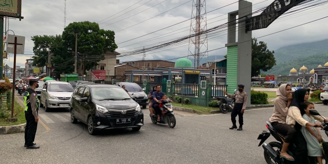 Guna mengurangi kemacetan akibat tingginya intensitas arus kendaraan menjelang berbuka puasa Personel Polres Aceh Tenggara mengatur situasi lintas di setiap simpang perkotaan di Kabupaten Aceh Tenggara, Minggu (02/04/2023).