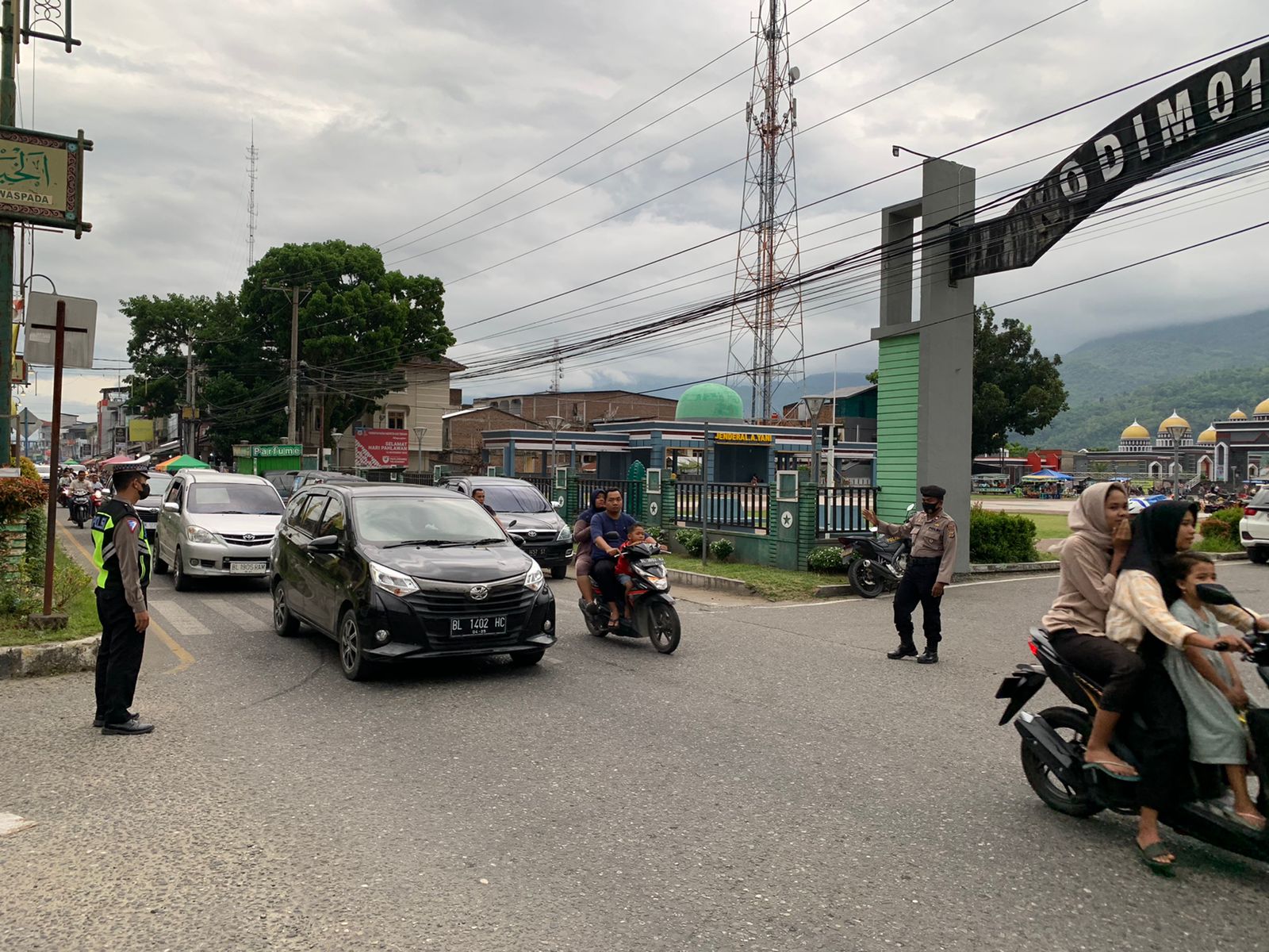 Guna mengurangi kemacetan akibat tingginya intensitas arus kendaraan menjelang berbuka puasa Personel Polres Aceh Tenggara mengatur situasi lintas di setiap simpang perkotaan di Kabupaten Aceh Tenggara, Minggu (02/04/2023).