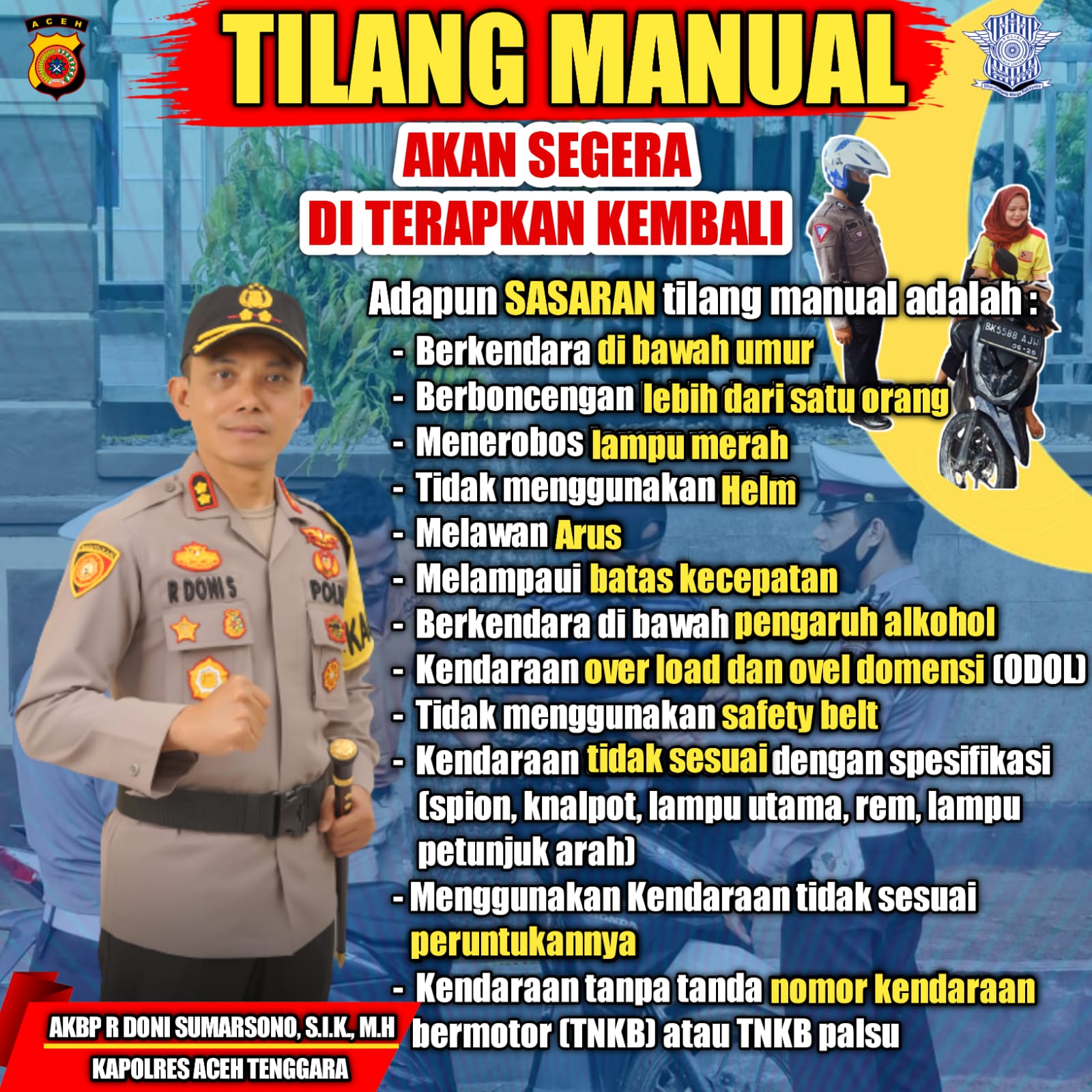 Pemberlakuan tilang manual dalam waktu dekat akan kembali diterapkan di Aceh Tenggara oleh petugas satuan lalu lintas (satlantas) Polres Aceh Tenggara.
