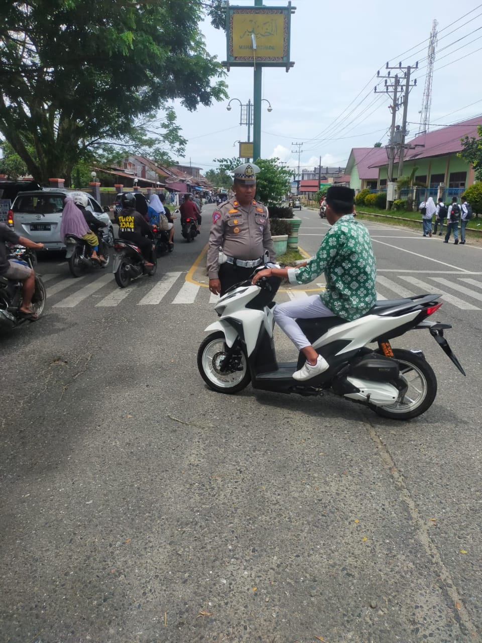 Kasat Lantas Aceh Tenggara Iptu Abdullah Husain, S.H P memberikan teguran secara langsung kepada para pelajar yang mengendarai sepeda motor saat hendak berangkat kesekolah, Senin (29/05/2023).