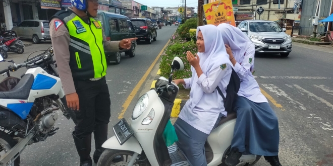 Anggota Sat Lantas Polres Aceh Tenggara memberikan teguran secara langsung kepada para pelajar yang mengendarai sepeda motor saat hendak berangkat kesekolah, Senin (19/06/2023).