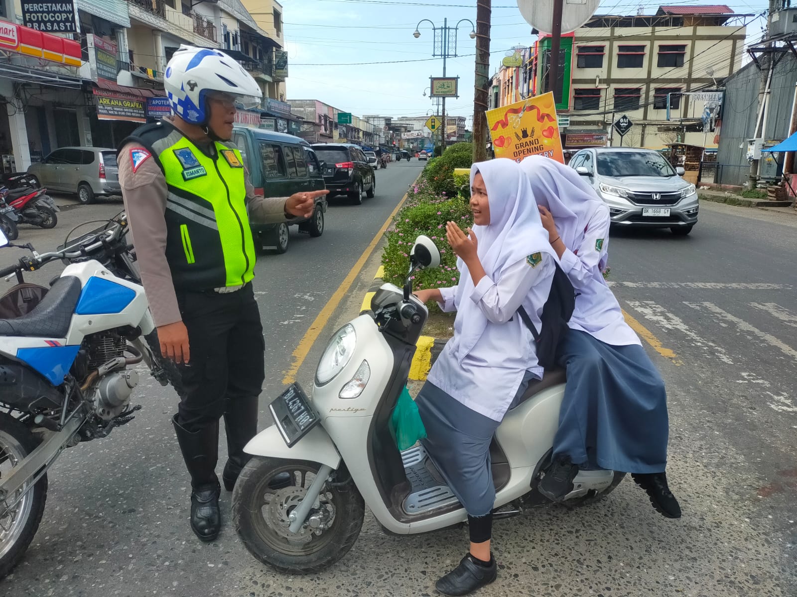 Anggota Sat Lantas Polres Aceh Tenggara memberikan teguran secara langsung kepada para pelajar yang mengendarai sepeda motor saat hendak berangkat kesekolah, Senin (19/06/2023).