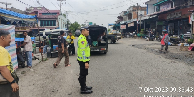 Personel Polres Aceh Tenggara Polda Aceh melaksanakan kegiatan pengaturan arus lalu lintas yang berfokus di Pasar Tumpah Lawe Sigala-gala. Kegiatan ini dilaksanakan guna memitigasi kemungkinan terjadinya kemacetan dan kecelakaan lalu lintas di pasar Sabtu (7/10/23) pukul 09.00 Wib.