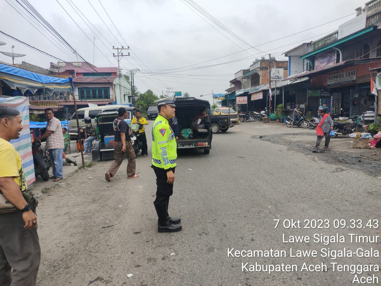 Personel Polres Aceh Tenggara Polda Aceh melaksanakan kegiatan pengaturan arus lalu lintas yang berfokus di Pasar Tumpah Lawe Sigala-gala. Kegiatan ini dilaksanakan guna memitigasi kemungkinan terjadinya kemacetan dan kecelakaan lalu lintas di pasar Sabtu (7/10/23) pukul 09.00 Wib.