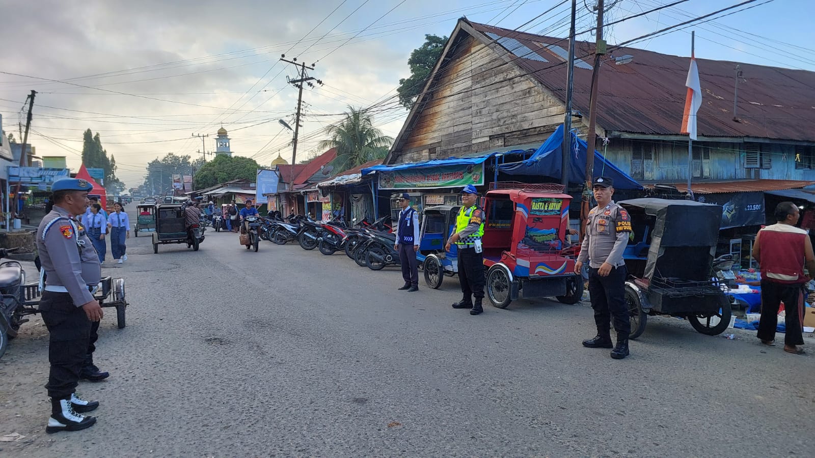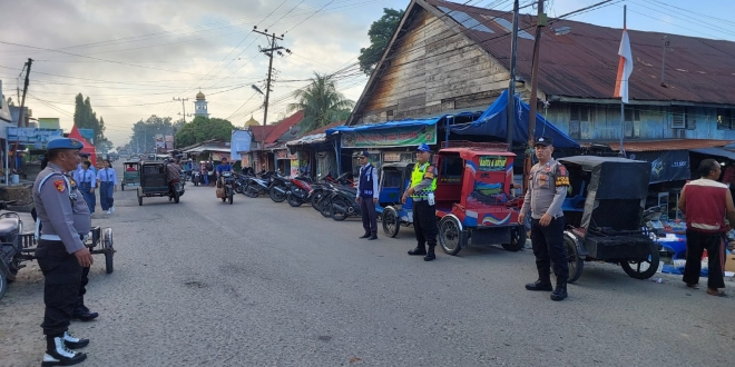 Personel Polsek Lawe Sigala-gala melakukan kegiatan Strong Poin di pasar Lawe Sigala-gala cegah terjadinya kemacetan di pasar. 20 Desember 2023