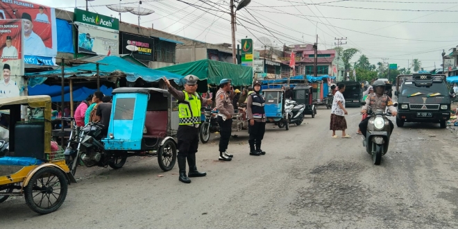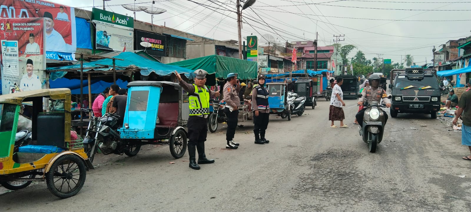 Personel Sat Lantas Polres Agara Melakukan Pengaturan Arus Lalu Lintas di Pasar Tumpah Lawe Sigala-gala
