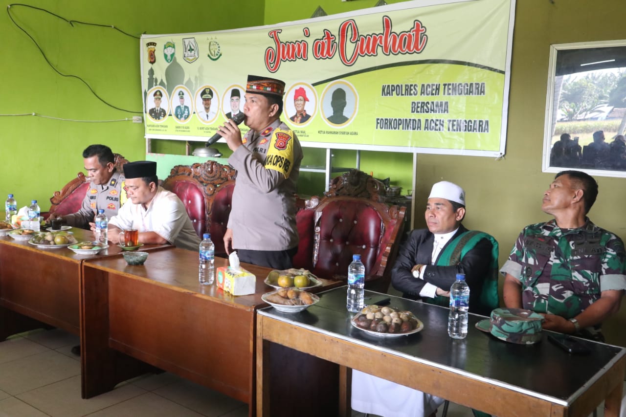 Wakapolres Aceh Tenggara, Kompol Ichsan Pradita, S.E, memimpin kegiatan Jumat Curhat bersama Forum Koordinasi Pimpinan Daerah (Forkopimda) Aceh Tenggara di Warkop Pak Roby, Desa Sepakat, Kecamatan Semadam. Kegiatan rutin ini bertujuan sebagai wadah untuk tukar pikiran, mendengarkan keluhan masyarakat, dan mencari solusi atas permasalahan yang dihadapi oleh warga di tengah masyarakat. 12 Januari 2024